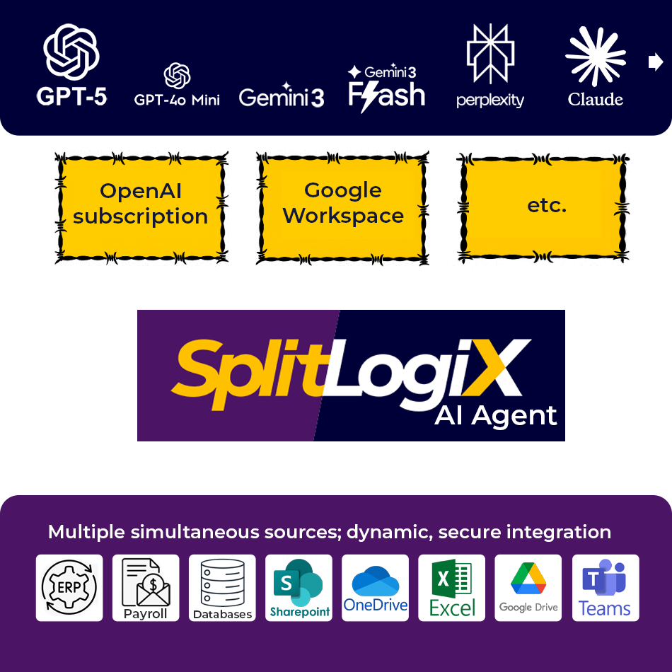 The exact configuration of every SplitLogiX AI Agent depends on our Client’s specific Sources of Information, preferred or recommended AI models from the AI principals, and the security environment required.